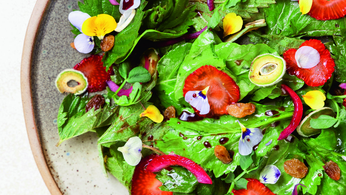 Bu tarifte kuzukulağının karakteristik ekşi tadı, taze çileklerin yumuşak ve tatlı aromasıyla dengelenir. Çağla, kuru üzüm ve kırmızı soğan turşusu gibi farklı dokular ise salataya katmanlı bir lezzet kazandırır.