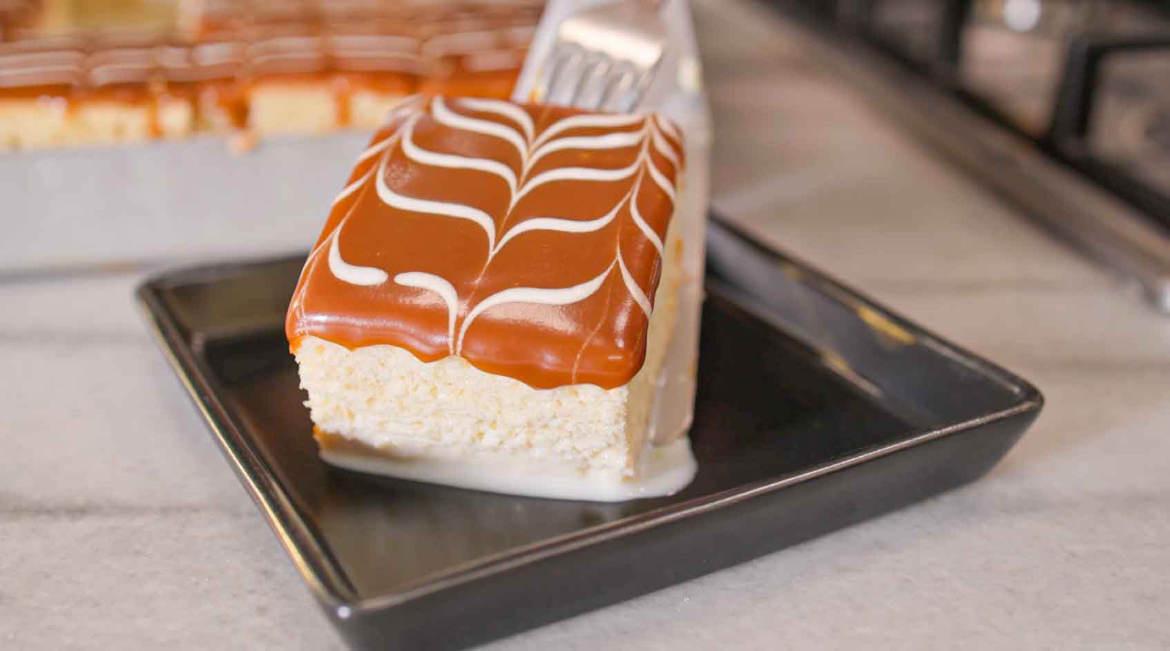 • Hazırladığınız karameli sütü iyice çekip genişlemiş trileçenin üzerine yayın. Kalan 50 ml kremayı hafif yoğunlaşana dek 1 dakika çırpın. Sıkma torbasına koyup ucuna ince bir delik açın. Karamelin üzerine kremayla enlemesine şeritler çizin. Kürdanla boylamasına git gel yaparak kremanın üzerinde ebru deseni yapın. Efsane trileçeemrinize amade!