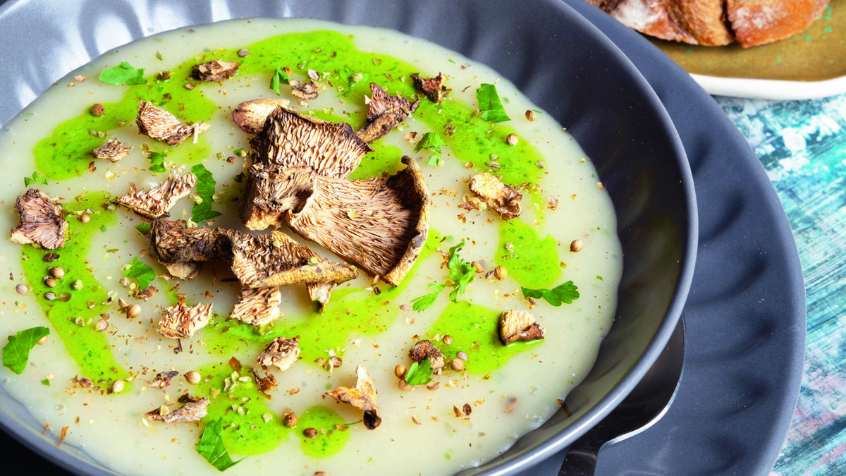 Servis sırasında çorbanın üzerine gezdirilen yeşil yağ, kenara ayrılan kanlıca mantarları ve serpiştirilen kişniş tohumu ile birlikte sunum adeta görsel bir şölene dönüşüyor.