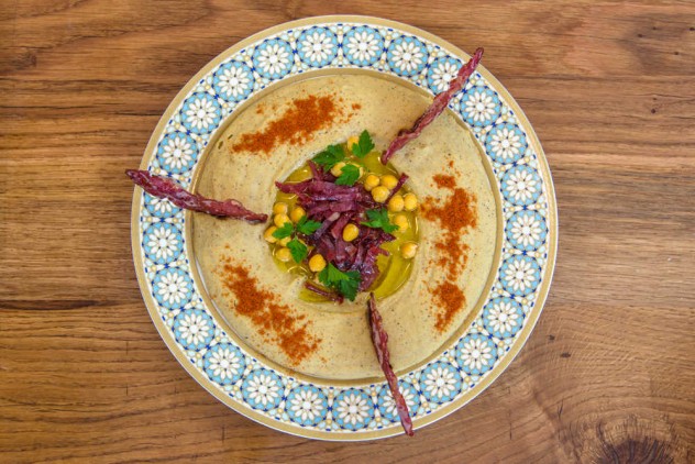 Humusunuzun üzerine dilimlediğiniz pastırmalar, birkaç adet nohut tanesi ve maydanoz yaprakları ile süsleyin.
