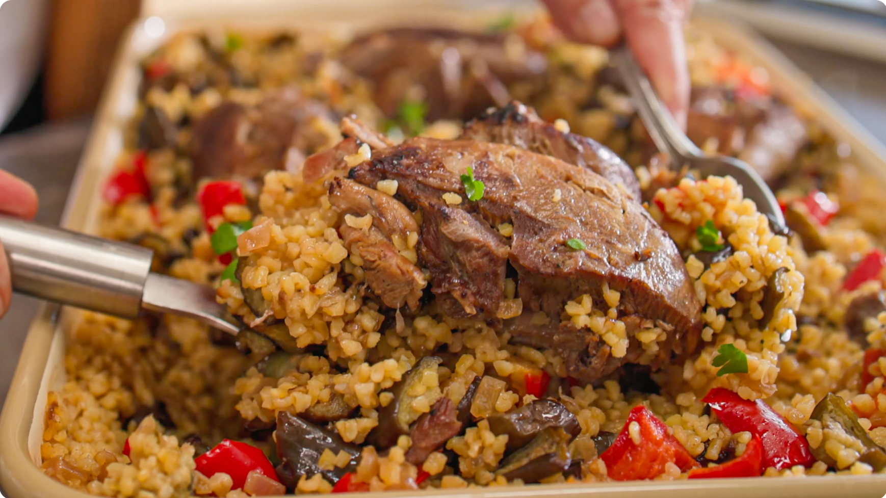 • Geniş bir fırın tepsisini ocağa alın. Altını kısık ateşte açın. 2 çorba kaşığı tereyağı ve 1 çorba kaşığı zeytinyağını tepsiye koyun. Tavadaki soğan ve kapyayı, 3 su bardağı pilavlık bulguru ekleyip karıştırın ve kavurun. Her bulgurun tanesinin yağlandığına emin olun. Kızarmış patlıcanları ve 1 tatlı kaşığı tuzu ilave edip karıştırın.