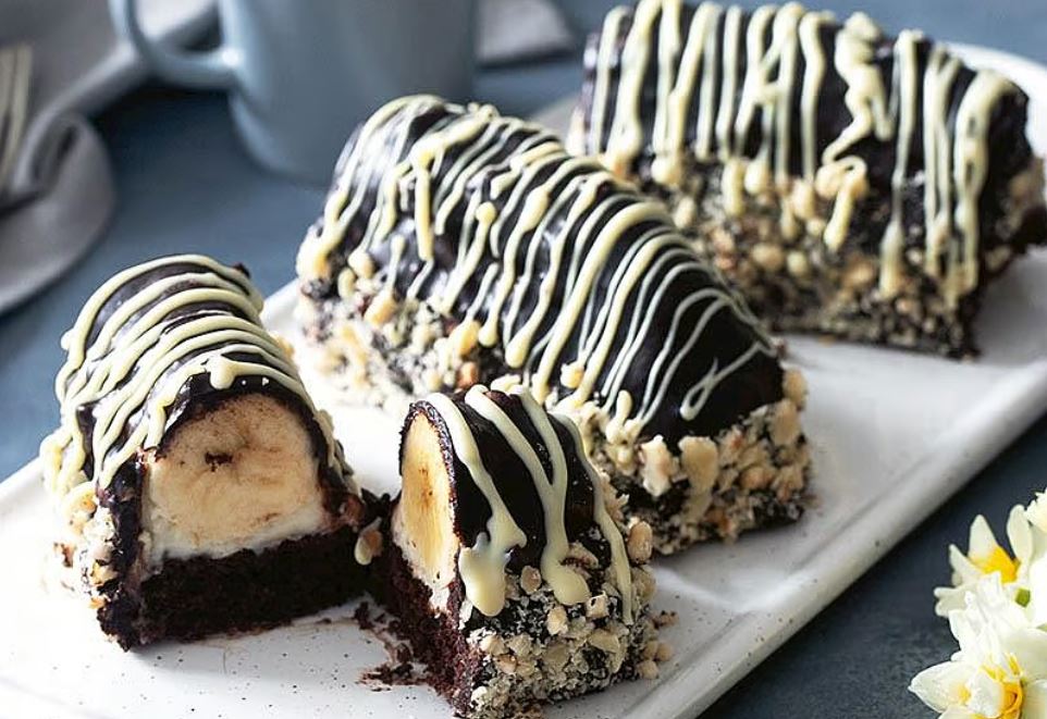 Soğuyan kek eşit parçalara kesilir. Keklerin üzerine hazırlanan muhallebi sürülür ve dilimlenmiş muzlar yerleştirilir. Üzerine çikolatalı ganaj sosu dökülür. Aynı işlem tüm kekler için uygulanır.