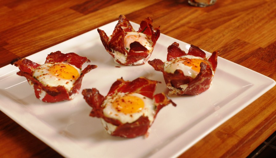 4 adet pastırma dilimi kullanarak kabın altını ve etrafını saracak şekilde dizin. Servis edeceğiniz kişi sayısı kadar göze aynı işlemi tekrarlayın.