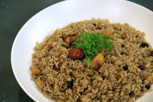 Pirinçleri ilave edin ve bir tur çevirin. Ardından tuz, karabiber, yenibahar, dolmalık fıstık ve kuş üzümlerini ekleyip kavurmaya devam edin. Kestaneyi ekleyin, birkaç tur karıştırın. suyunu ve toz şekerini ekleyin, karıştırın ve kapağı kapalı olacak şekilde harlı ateşte suyu kaynayana kadar pişirin.