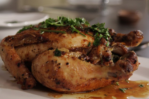 Orta boy bir tavuğun içini iyice yıkayıp, kurulayın. Üzerini deniz tuzu ve iri çekilmiş değirmen karabiber ile iyice ovalayın. Bir limonun kabuğunu rendeleyin ve suyunu sıkın, Üzerine 4 kaşık zeytinyağı ilave edip bu karışımı da tavuğun her yerine sürün. Ayrı bir kapta 2 demet maydanozun üzerine 1 çay bardapı krama, 1 çay bardağı yogurt, tuz karabiber ve toz zencefili ilave edin ve iyice karıstırın. Bu harcı tavuğun içine doldurun ve açık yerleri kürdanla kapatın. 200 derece fırında 1 saat kadar pişirin. 15 dakikada bir süzülen suyu kaşıkla tekrar tavuğun üzerine verin. Pişen tavuğu taze kişniş doğrayarak servis edin