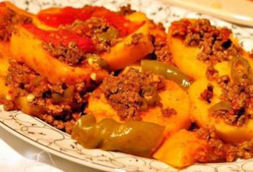 Fırın tepsisine kızarttığınız patatesleri dizin. Üzerlerine hazırladığınız kıymalı karışımı ve rendelenmiş/domates dilimlerini yerleştirin. En üste biber dilimlerini koyun. 180 derece önceden ısıtılmış fırında yaklaşık 25 dakika pişirin. Afiyet olsun!