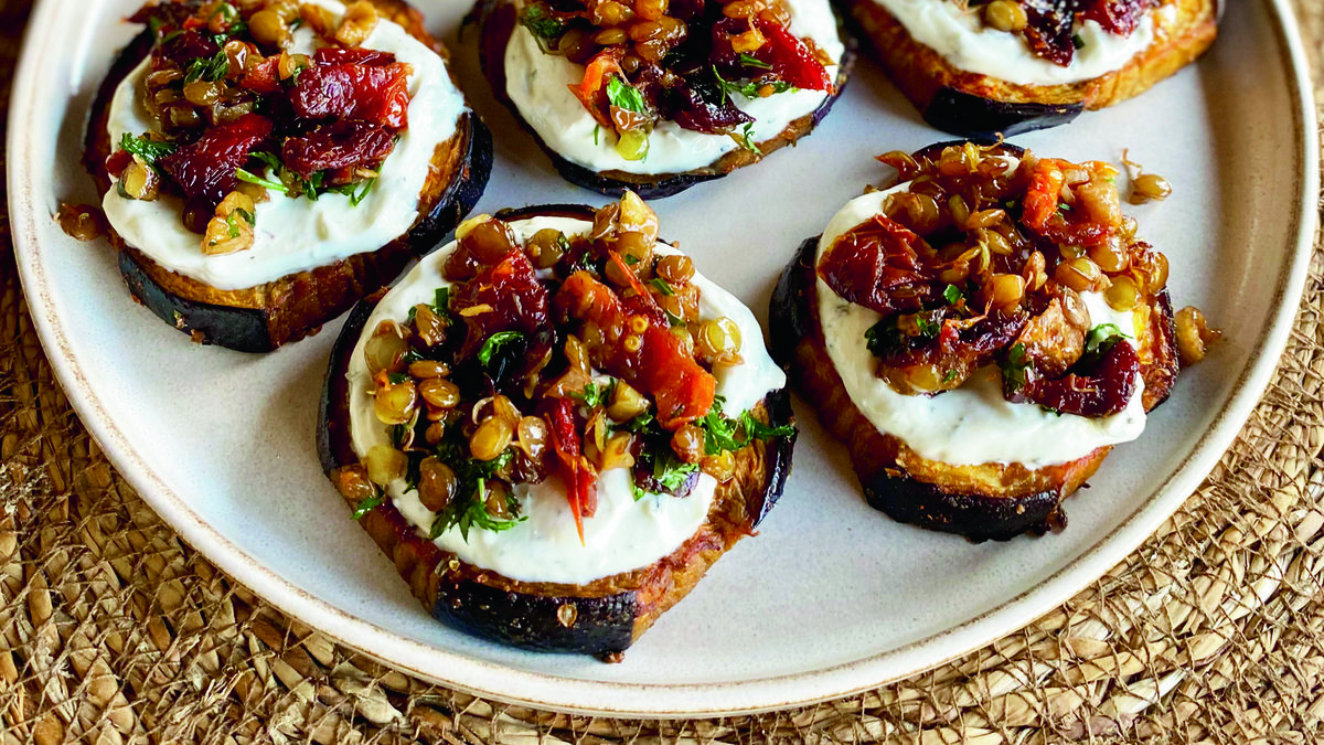 Fırından çıkan patlıcan dilimlerinin üzerine önce yoğurt sosunu, ardından mercimekli karışımı ekleyin. Ilık veya sıcak servis yapın.