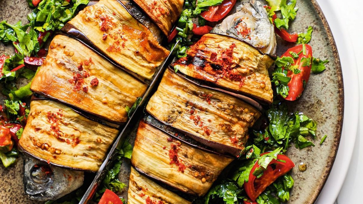 Patlıcana sarılı çipura, yanında hafif bir yeşil salata ve limon dilimleri ile servis edildiğinde dengeli bir öğün oluşturur. Özel davet sofralarında şık sunumuyla öne çıkar.