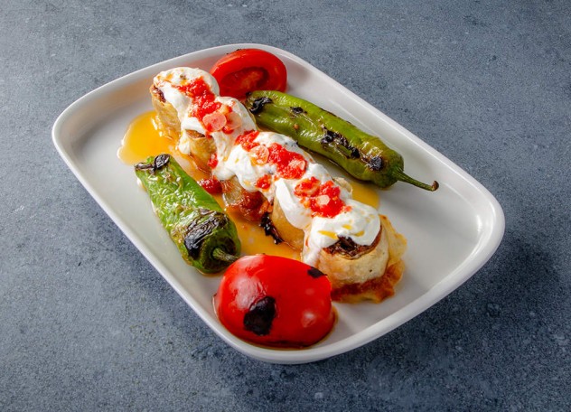Üzerine isteğe göre sarımsaklı yoğurt koyup, hazırladığınız domatesli sosu ekleyin ve ızgara domates, biberle sıcak servis edin.