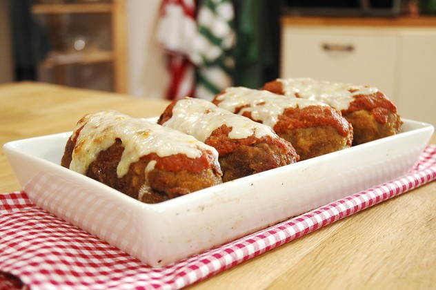 Kızaran köfteleri fırın kabına alın ve üzerilerine bir kaşık domates sos ve bir tutam kaşar peyniri serpip, 180 derecede önceden ısıtılmış fırında 10-15 dakika pişirin.