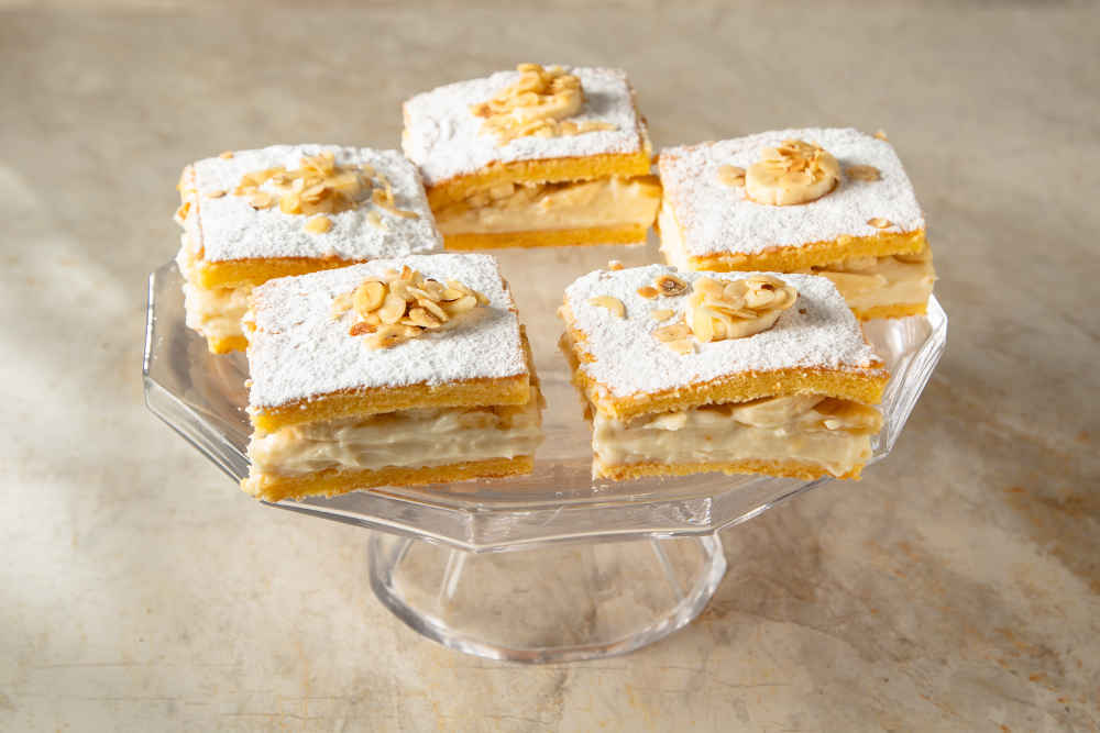 Üzerine soğuyan kremayı yayın ve dilimlediğiniz muzları yerleştirin.
