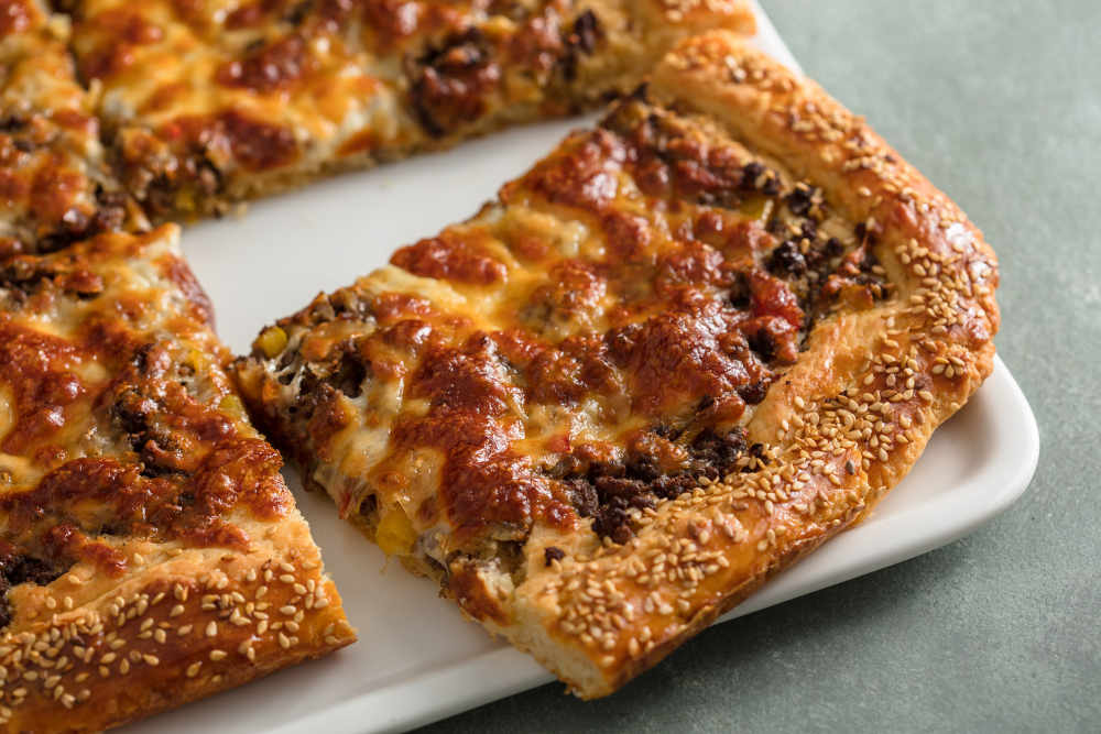 İç harcın üzerine rendelenmiş kaşar peyniri serpiştirin ve 180 derecede önceden ısıtılmış fırında 25 dakika pişirin.