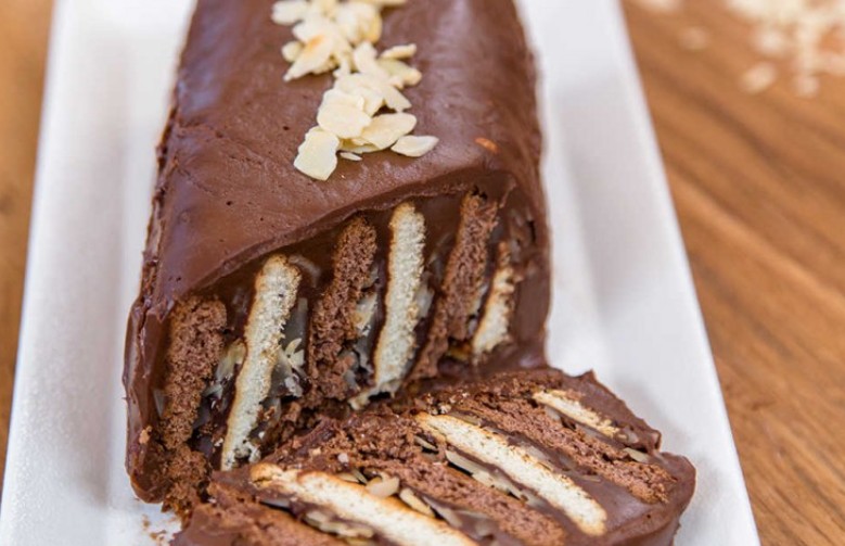 Bisküvileri bir kakaolu, bir sütlü olacak şekilde her birini file bademe batırarak kalıbınıza dizin.