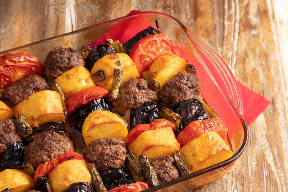 Dikdörtgen cam fırın kabınıza patlıcan, patates, domates, biber ve köfteyi dilediğiniz sırayla dizin.