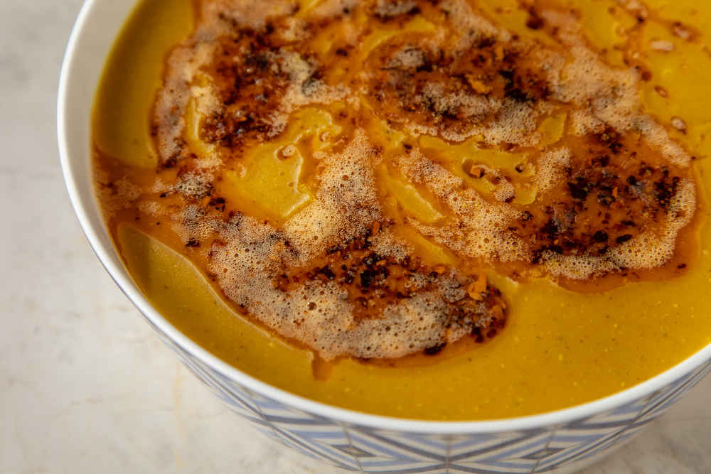 Tarifte tereyağı ve zeytinyağı ile sotelenen soğan, çorbaya derin bir aroma katarken; patates ve mercimek birleşimi kıvamlı bir yapı oluşturuyor. Zerdeçal ve kimyonun eklenmesiyle birlikte ortaya çıkan lezzet, klasik tariflerden farklı bir deneyim sunuyor. Et suyu ile zenginleştirilen çorba, kaynadıktan sonra blenderdan geçirilerek pürüzsüz hale getiriliyor.