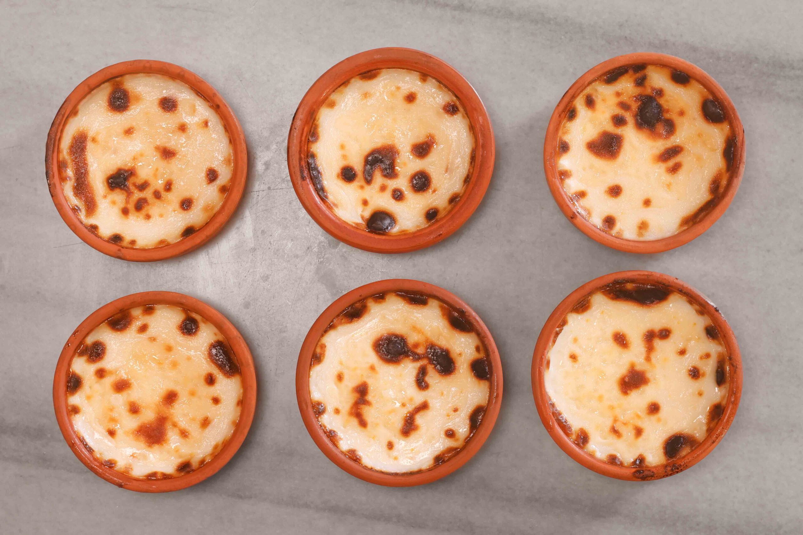 • Şeker eriyince sütlacı 6 tane yayvan çömleğe paylaştırın. Her çömleğe eşit miktarda tane ve suyundan koymaya özen gösterin. Doldururken üzerlerinde yarım cm boşluk bırakın ki fırında kabarıp taşmasınlar.