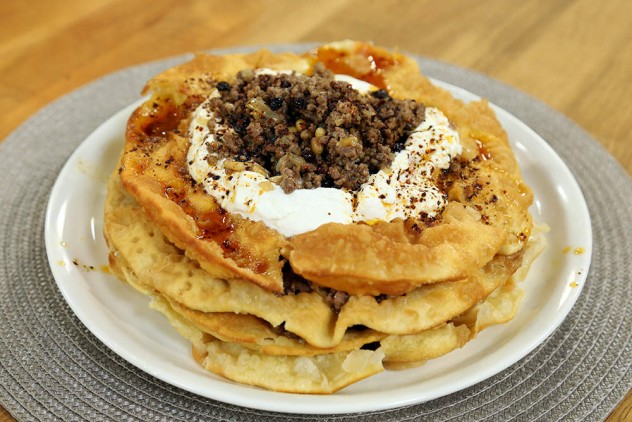 Bu arada iyice renk alıp kızaran hamuru önce bir peçetenin üzerine alıp yağından arındırın, ardından hiç vakit kaybetmeden et suyunu alın. Hamur iyice ıslandıktan sonra suyundan süzüp servis tabağına alın. Aynı anda diğer bir hamuru da kızartıp aynı şekilde et suyunu batırın. Tüm hamuru bu şekilde hazırlayın.