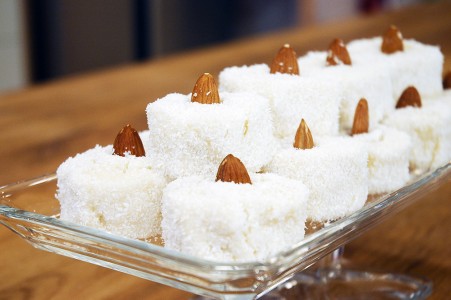 Lokumları hindistan cevizine bulayın ve bademle servis edin.