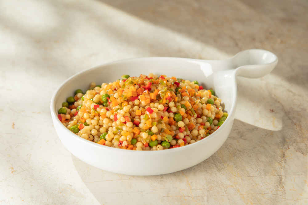 Haşlanan kuskusları bir kevgir yardımıyla suyunu süzerek sebzeli karışımın içerisine ekleyin.