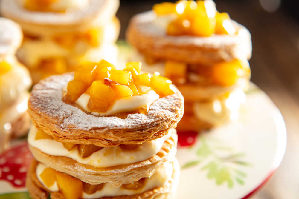 Ardından hazırladığınız şeftalili karamelden koyun ve milföyünüzü 3 kat olacak şekilde hazırlayın.