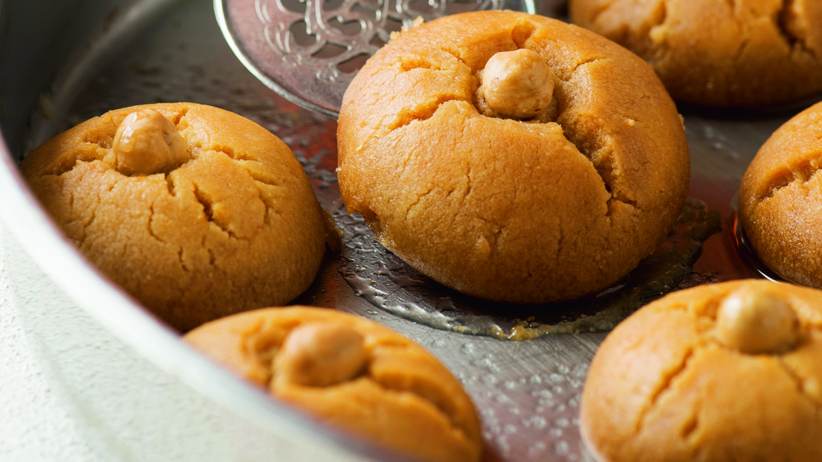 Hamurdan ceviz büyüklüğünde parçalar koparıp yuvarlayın. Hafifçe bastırarak tepsiye aralıklı şekilde dizin. Ortalarına fındık veya badem yerleştirin.