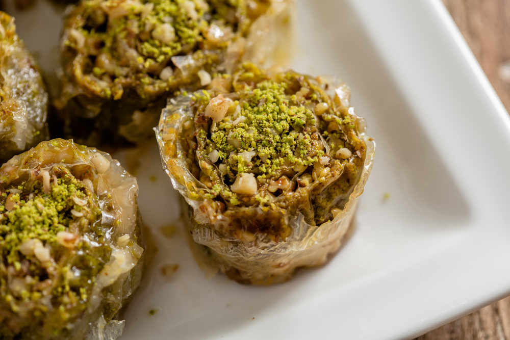 Tekrar toz antep fıstığı ya da ceviz serpiştirin ve geniş kenarından başlayarak sıkıca sarın.