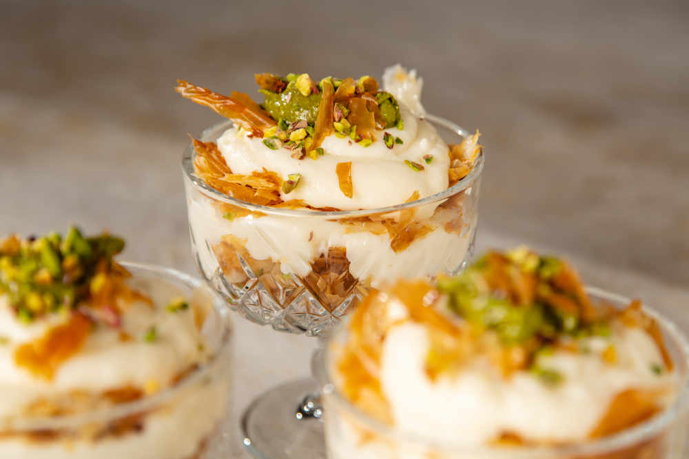 Üzerine tekrar kremadan sıkıp antep fıstığı ezmesinden gezdirip bir parça yufkayla servis edin.