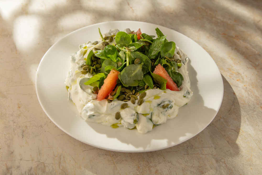 Ortasına kalan semizotu, taze nane yaprağı, kabak çekirdeği ve segment çıkartılmış greyfurtu yerleştirin.