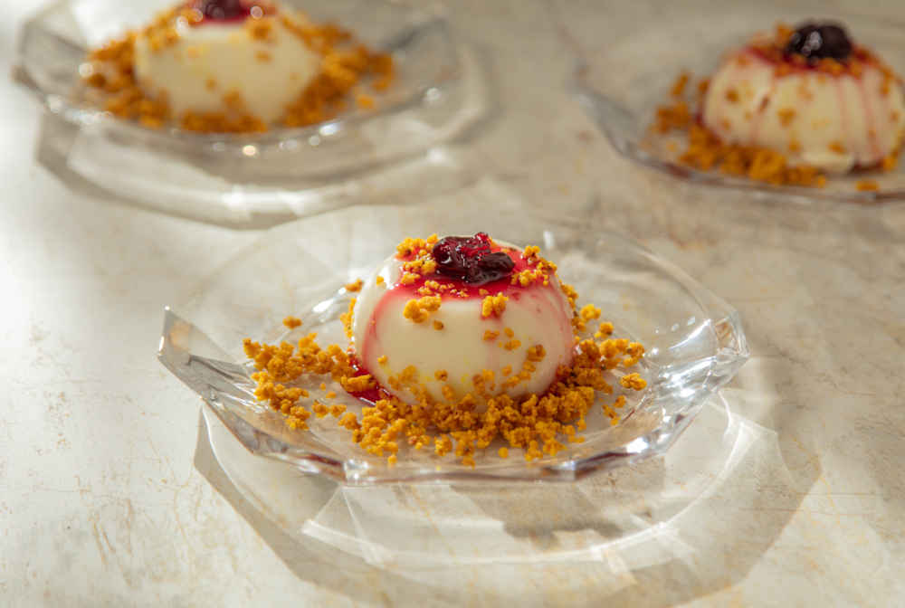 Kenarlarına crumble’dan serpiştirin ve üzerine vişne reçeli gezdirerek servis edin.