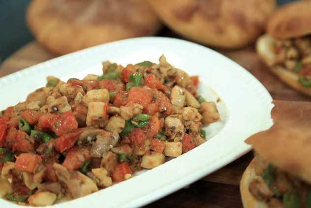 Sivri biberleri ince ince dilimleyin, domatesleri dörde bölün ve iç çekirdeklerini alıp etli kısmını küçük küpler olacak şekilde doğrayın.