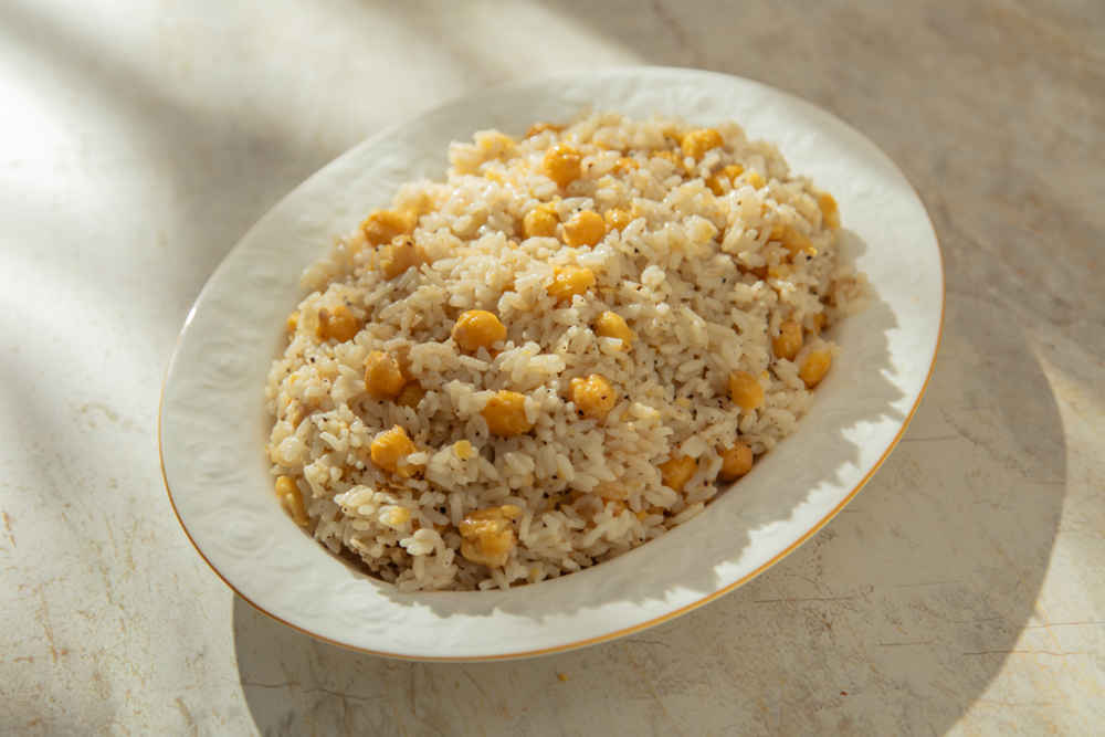 Hafif kavrulan pirincin üzerine haşlanmış nohut, tuz ve karabiberi ilave edip karıştırın.