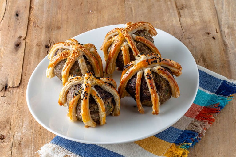 Kestiğiniz milföyleri her bir köftenin üzerine dörder tane gelecek ve üst üste bir kafes haline gelecek şekilde dizin.