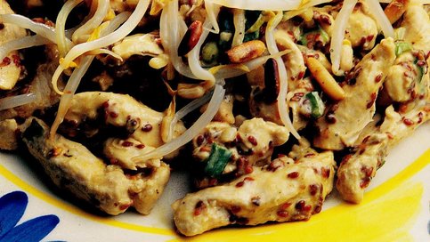 Soğuyan tavuk etleri bu sos ile harmanlanıyor ve servis tabağına alınıyor. Üzeri soya filizi ve kavrulmuş dolmalık fıstık ile süslenerek servis ediliyor.