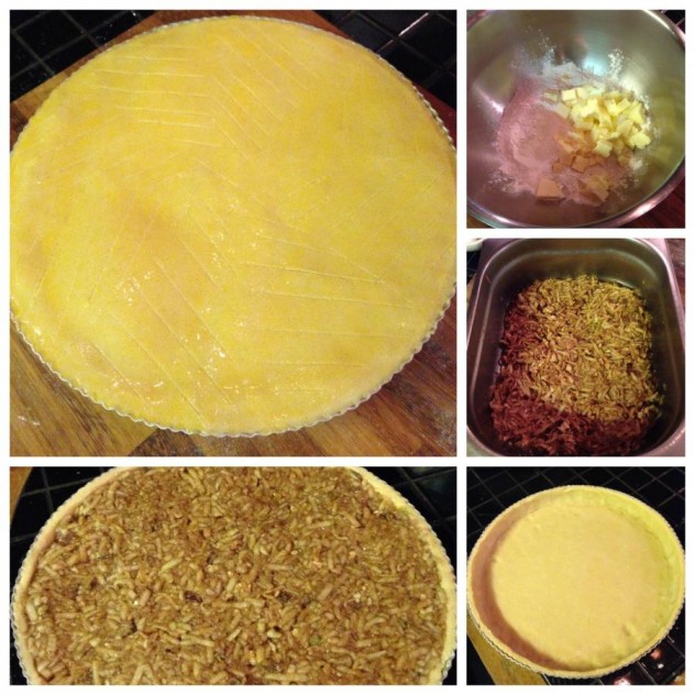 Hamuru alıp, taban olacak sekilde merdane ile açın ve pişirme kalıbına yerleştirin. İç harcı içine ekleyin. Kalan hamuru da açıp üzerine kapak yapın, kenarlarını yumurta akı ile yapıştırın.