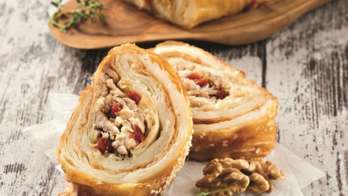 Fırından alınan yufka 15 dakika kadar dinlendirilir. Üzerine didiklenmiş tavuk, ceviz, doğranmış kuru domates ve kaşar peyniri eklenir. Rulo pasta sarar gibi dikkatlice sarılır.