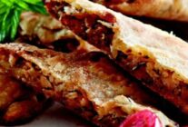 Kalan iki yufka da aynı şekilde her katı yağlanarak üst üste tepsiye yerleştirilir. Önceden ısıtılmış 200 derece fırında üzeri kızarana kadar pişirilir.