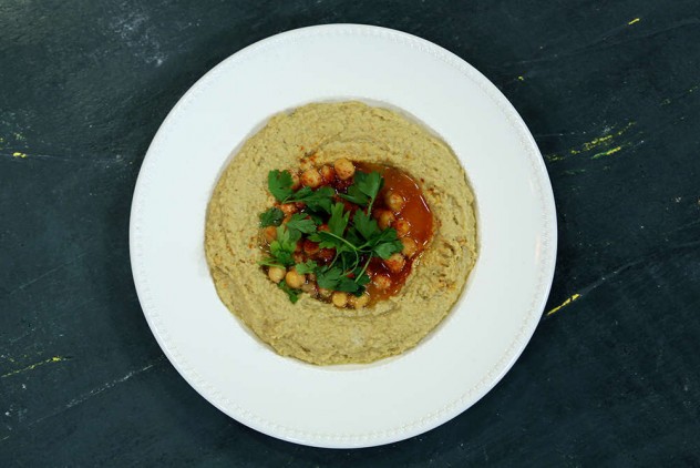 Humus karışımını servis tabağına yayın, orta kısmında hafif bir çukur açın.