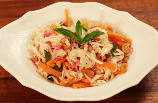 Tavuğu elinizle ya da bir çatal yardımıyla didikleyin, lahanayı ince kıyın, havuçları jülyen doğrayın, naneleri ve kajun fıstığını olduğu gibi bırakıp hepsini bir kaba koyup harmanlayın.