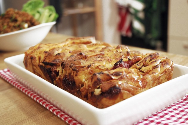 Ardından pasta dilimler gibi bu katları 4’e bölüp, üst üste yerleştirin. Dikdörtgen fırın kabına yerleştirin. Üzerini kapatıp 30 dakika daha mayalandırın.