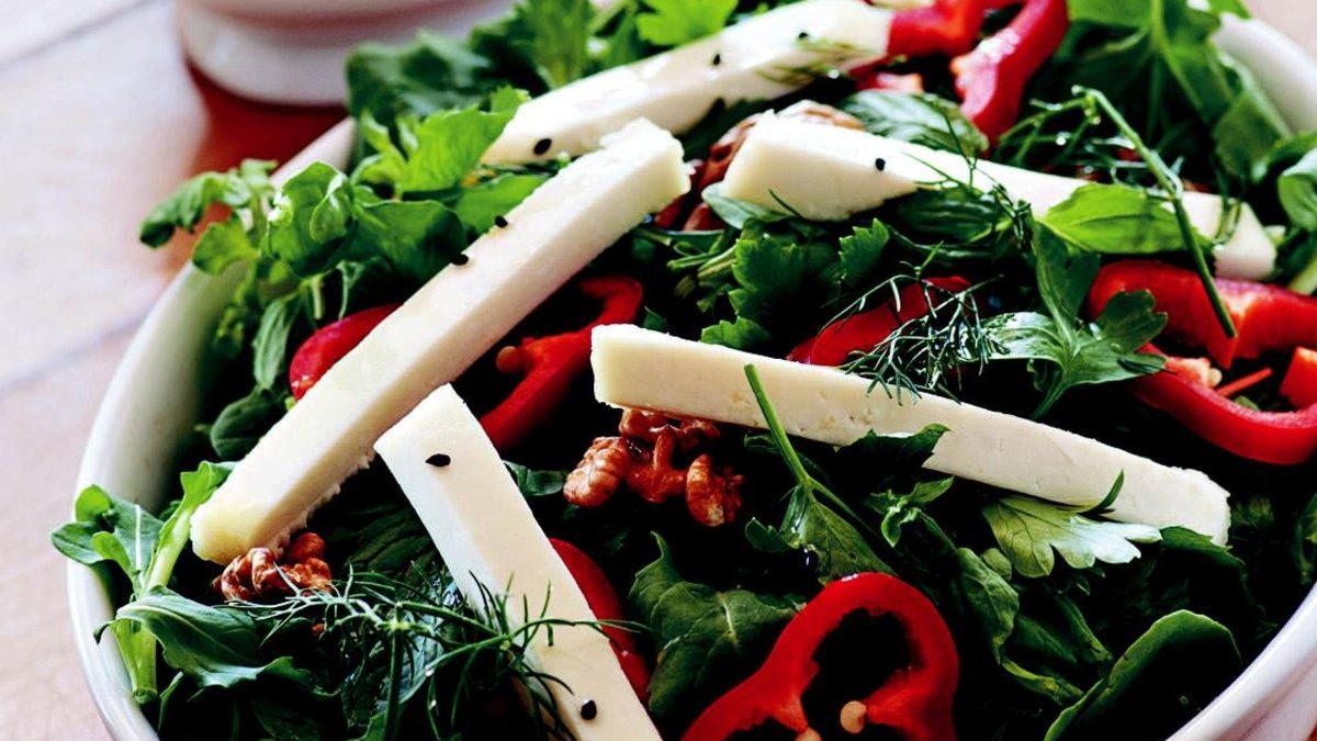 Tüm yeşillikleri bol suyla iyice yıkayıp süzün. Elinizle küçük parçalara ayırın (bıçak kullanmamaya özen gösterin, bu sayede yeşillikler ezilmez). Servis tabağına alıp karıştırın. Üzerine ceviz ve ufalanmış beyaz peyniri ekleyin.