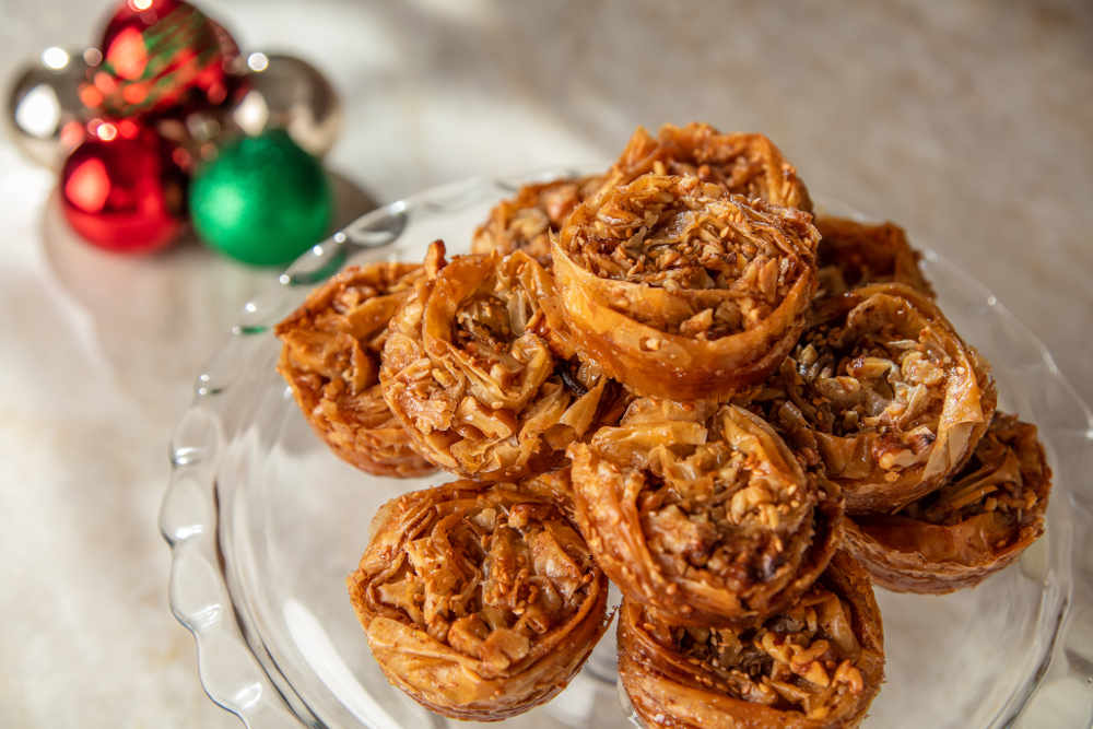 Yufkanın üzerine ceviz, esmer şeker ve toz tarçın serpiştirip yelpaze gibi katlayın.