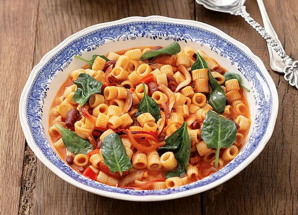 Yaklaşık 8 dakika pişirildikten sonra haşlanmış Meksika fasulyesi, ıspanak yaprakları ve kalan zeytinyağı eklenir. Makarna mantı kıvamına ulaştığında ocaktan alınır.